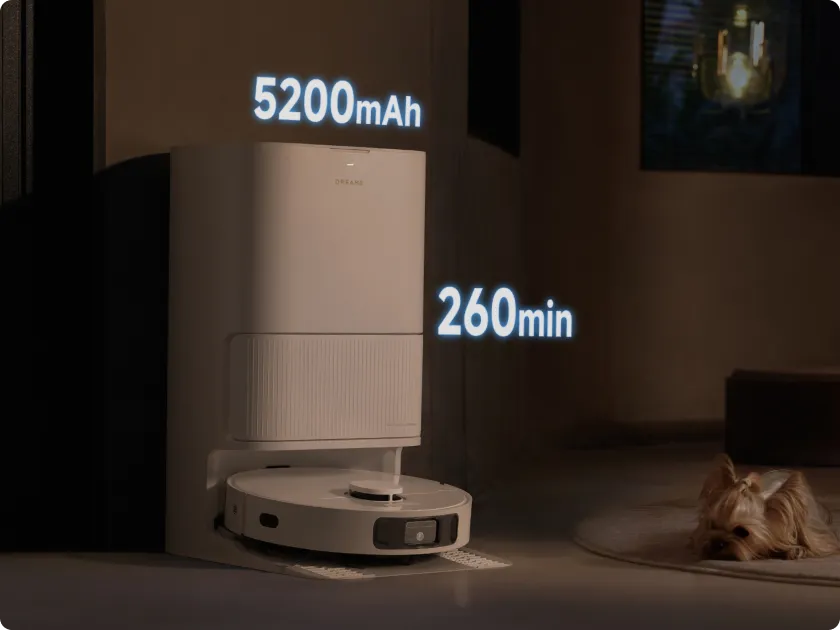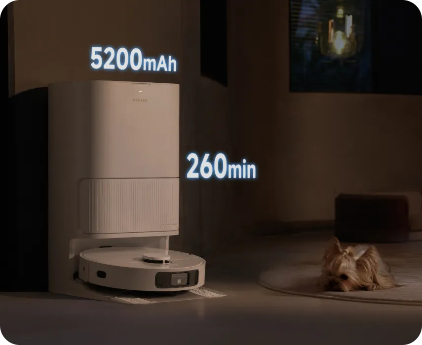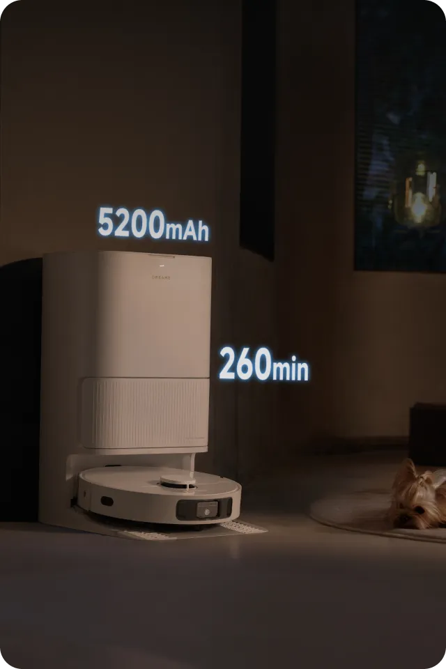 Med ett generöst 5 200 mAh-batteri ger D20 Ultra oavbruten städning i upp till 260 minuter* på en enda laddning. Tillsammans med 30 %* snabbare laddning är du redo att städa snabbt.