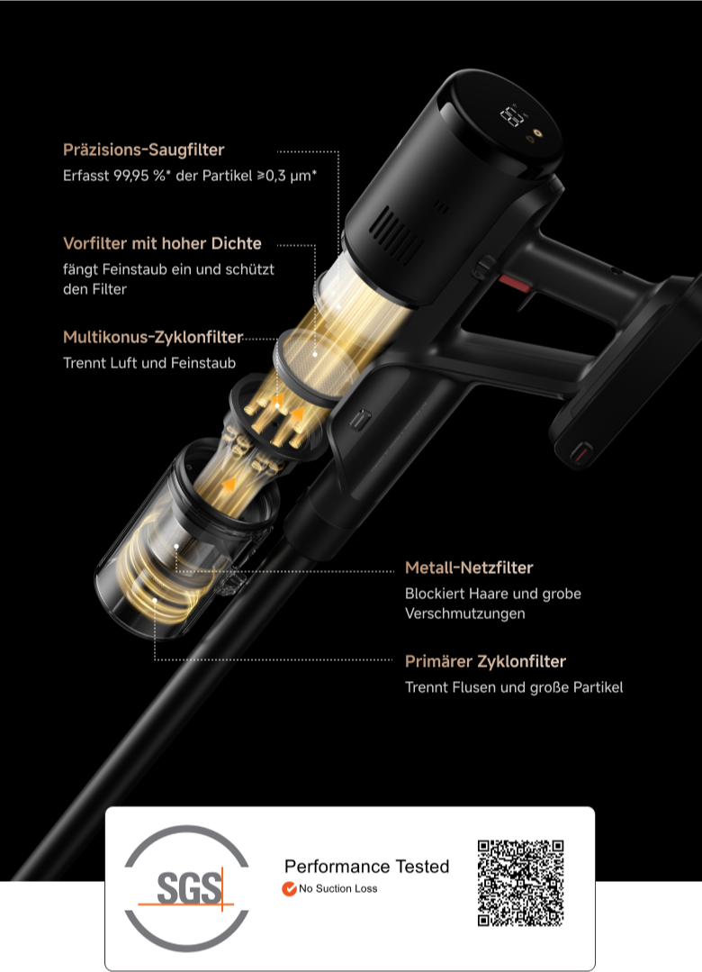 *Sugeffekt på 23 000 Pa: Baserat på GTT Surface Cleaning & Air Treatment Laboratory. Rapportnummer: 0369-25A-01 och 0369-25A-04.