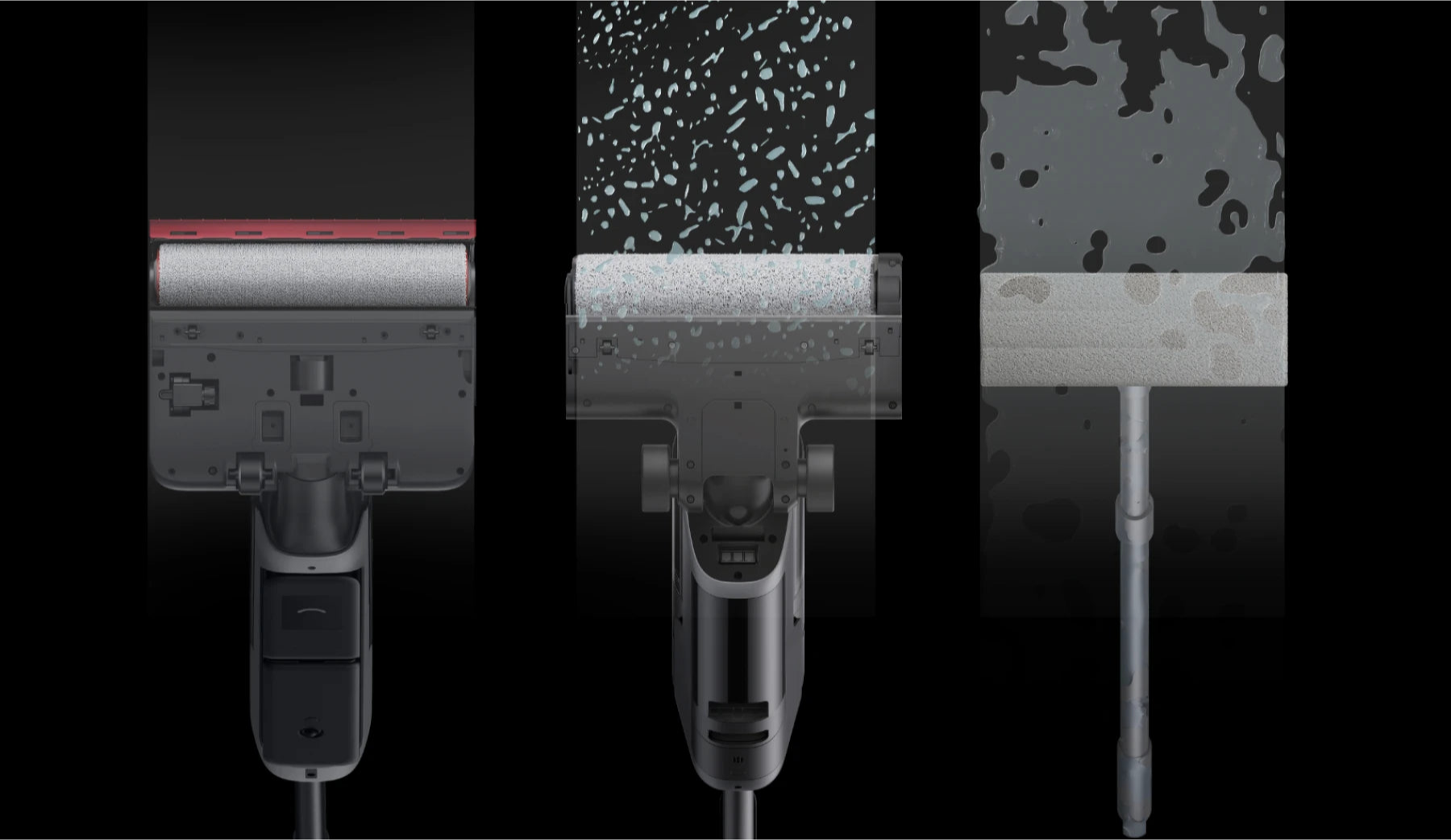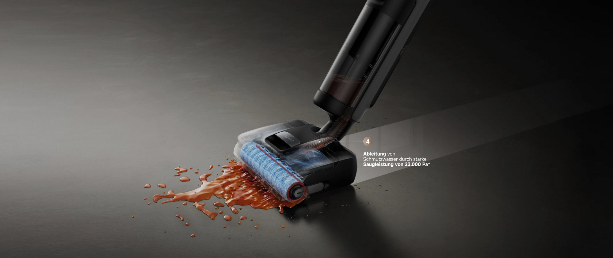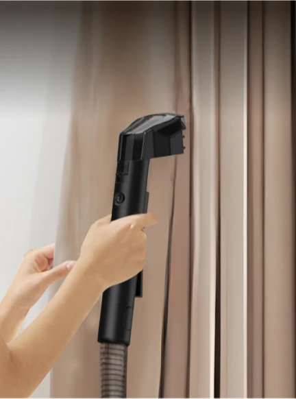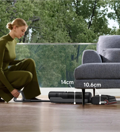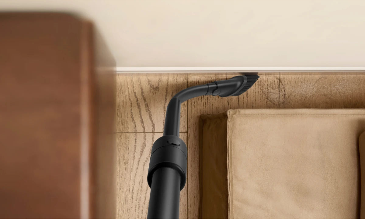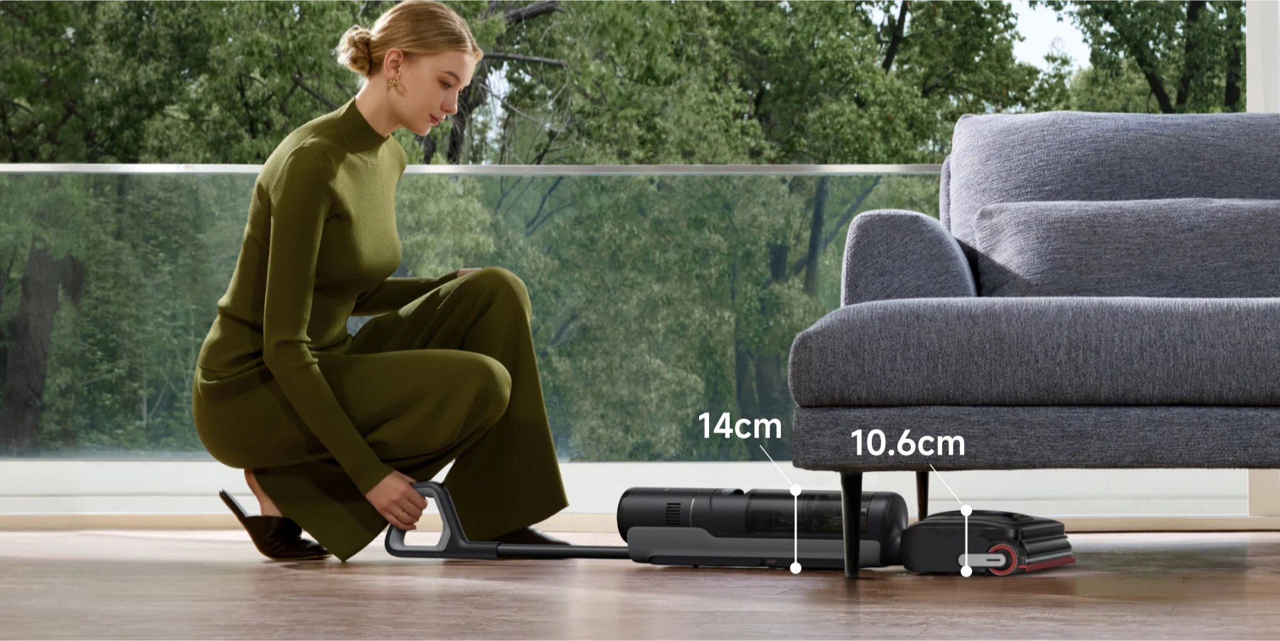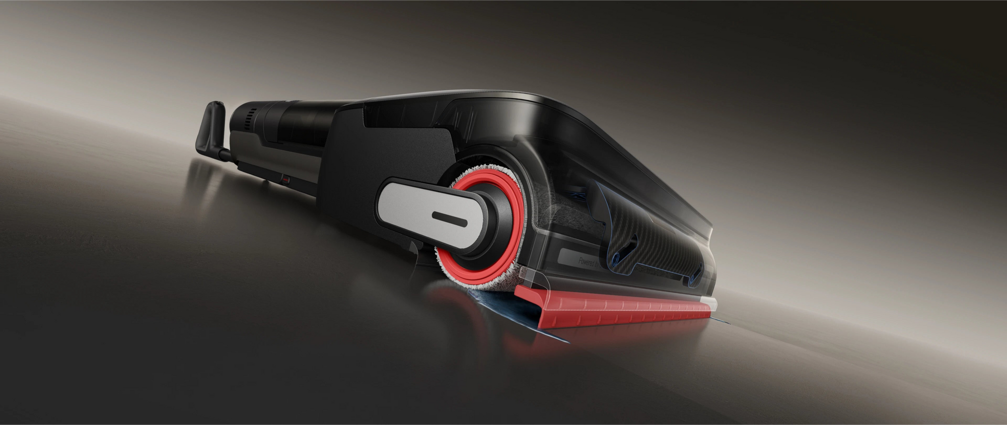 H15 kan fällas ned helt i 180 grader*, ligga platt mot golvet och nå under sängar, soffor och låga möbler utan problem. Vattenbehållaren för smutsigt vatten håller smutsvattnet borta, vilket skyddar motorn och gör att den upprätthåller en kraftfull sugeffekt på upp till 23 000 Pa för att klara även de snävaste utrymmena.
