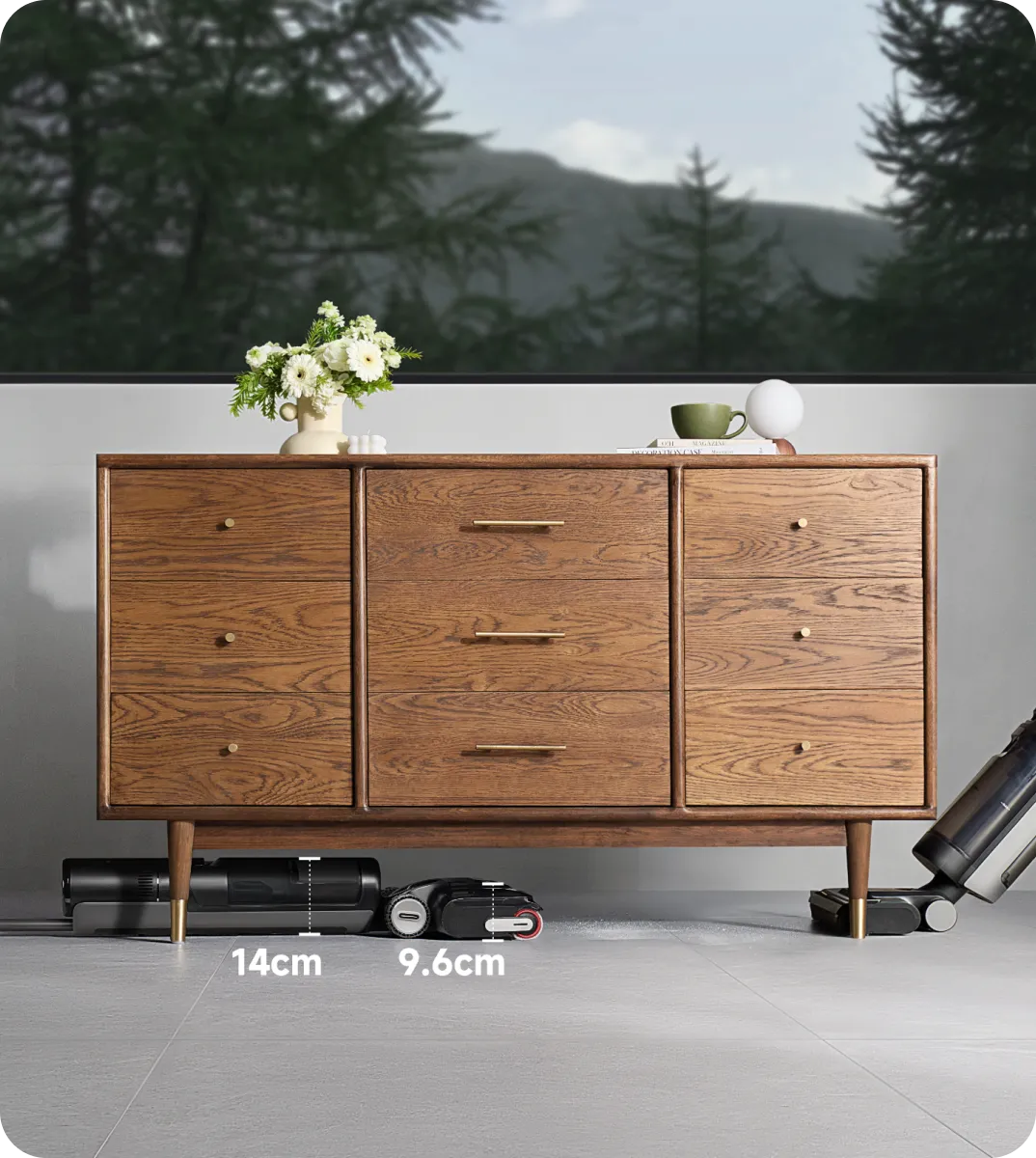 * 180 grader, 14 cm, 9,6 cm: Dammsugarens huvudenhet kan nå utrymmen så låga som 14 cm och borsthuvudet så lågt som 9,6 cm. Baserat på våra laboratorietester.