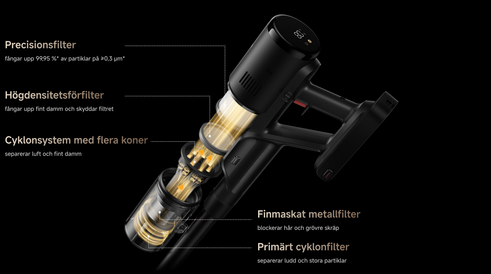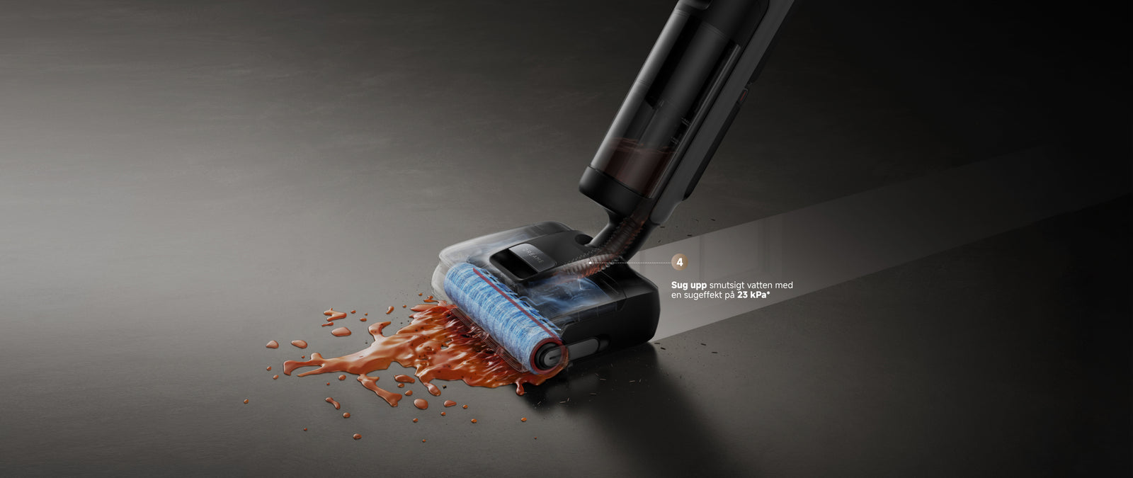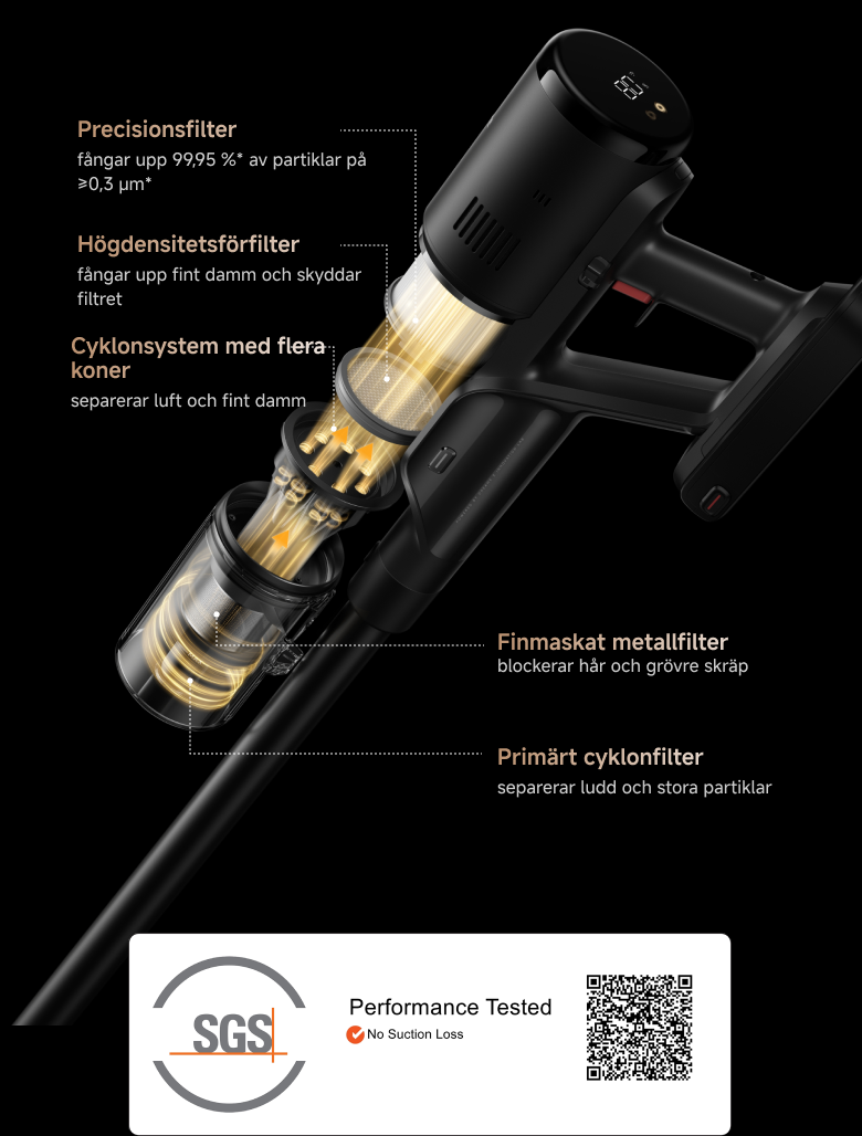 *Sugeffekt på 23 000 Pa: Baserat på GTT Surface Cleaning & Air Treatment Laboratory. Rapportnummer: 0369-25A-01 och 0369-25A-04.