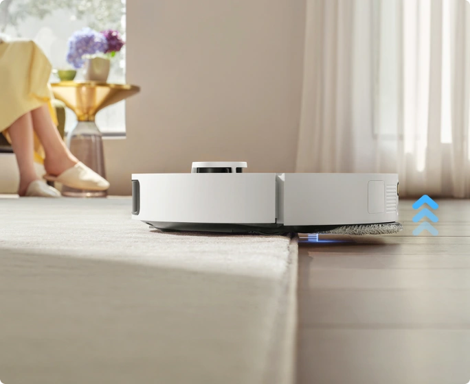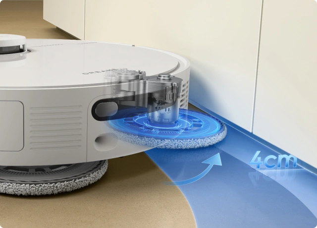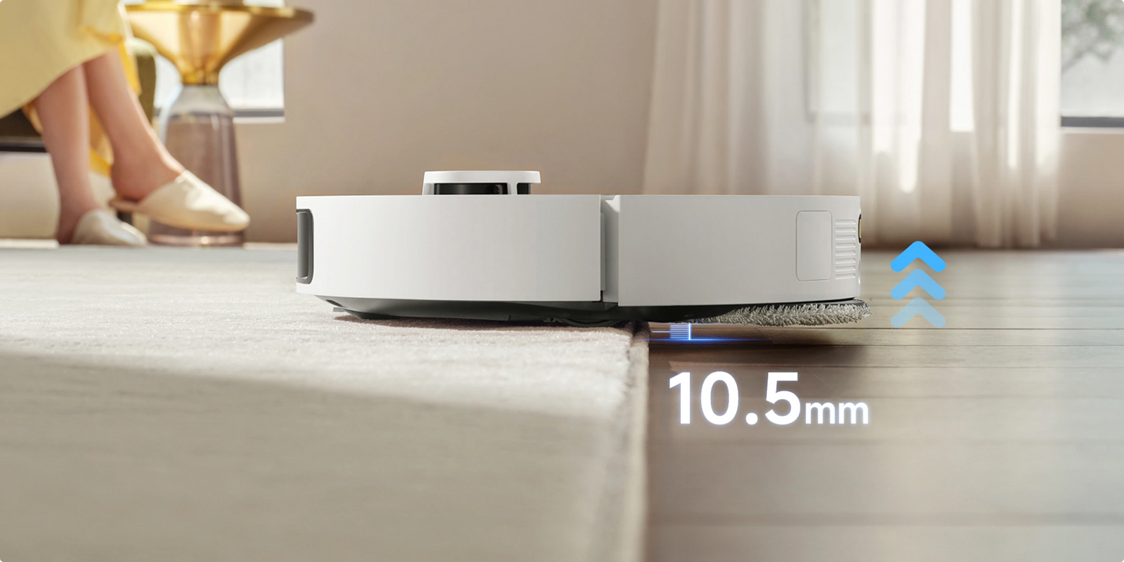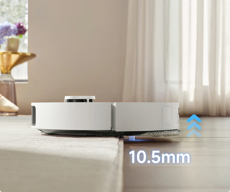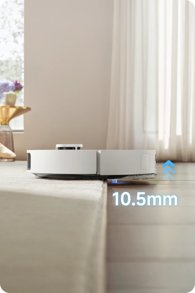 * 10,5 mm: Baserat på våra egna laboratorietester. Höjdskillnaden för robotdammsugaren före och efter mopplyftning är 10,5 mm.