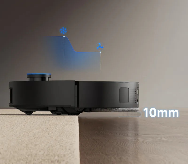* 10,5 mm: Baserat på våra laboratorietester. Höjdskillnaden för robotdammsugaren före och efter att moppen lyfts är 10,5 mm.