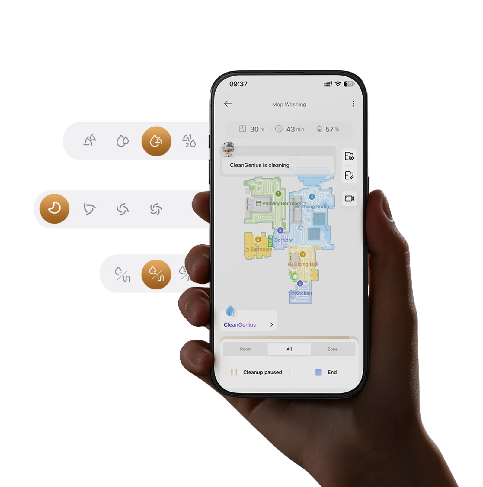 * Rengöring med varmvatten, 40 °C: Efter att mopparna tvättats med 100 °C varmvatten ligger mopparnas vattentemperatur ständigt mellan 30 och 40 °C efter en minuts städning, med en högsta temperatur på 40 °C. Data baserade på våra laboratorietester. Faktiska prestanda kan variera.